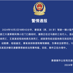 江西景德镇警方10月11日通报,10月2日18时42分许,廖某某(男,20 岁)驾驶一辆小型汽车行驶至昌江大道莱顿风情小区门口路段时,撞倒正在过马路的三名行人,造成胡某某当场死亡、王某某经现场抢救无效死亡、胡某受伤经送医抢救无效后死亡。经勘察、检验鉴定,廖某某排除酒驾毒驾嫌疑,负事故全部责任。10月3日,廖某某因涉嫌交通肇事罪被依法刑事拘留。目前,案件正在办理中。