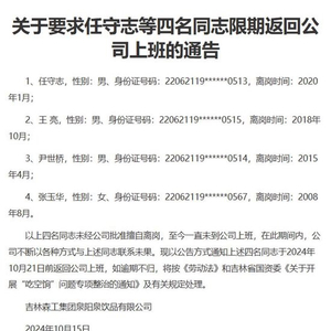 近日,吉林森工集团泉阳泉饮品有限公司的一则《关于要求任守志等四名同志限期返回公司上班的通告》(以下简称“通告”)引发热议,有人竟擅自离岗长达16年。10月17日,当事公司工作人员回应极目新闻记者称,一直在联系当事员工,但仍未联系上,“不在岗没有工资。”