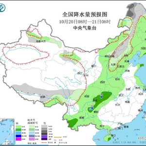 10月20日08时至21日08时,内蒙古中东部、黑龙江西北部、新疆沿天山地区、西藏中南部、甘肃河西、山西中北部、河北西北部、北京西部和北部、川西高原北部等地部分地区有小雪或雨夹雪,其中,内蒙古东北部、黑龙江西北部等地部分地区有中到大雪。重庆大部、湖北西南部、贵州西北部、云南西南部、山东半岛、台湾岛东北部等地部分地区有中到大雨,其中,台湾岛东北部部分地区有暴雨(50~80毫米)。内蒙古中东部部分地区有4~6级风(见图1)。