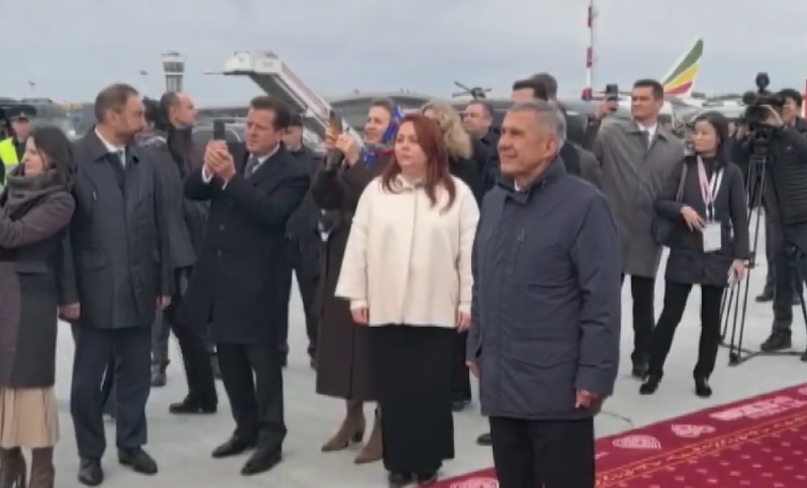 专机抵达喀山国际机场时,俄罗斯联邦鞑靼斯坦共和国行政长官明尼汉诺夫、共和国总理佩索申、喀山市市长梅特申和俄罗斯外交部高级官员在机场热情迎接。礼兵在红毯两侧列队致敬,身着民族服装的俄罗斯女青年用传统礼节表示欢迎。
