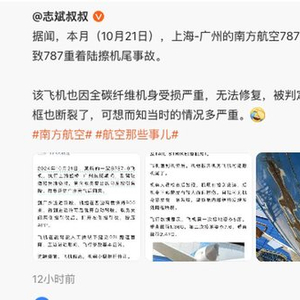 据悉,10月21日午间,南方航空CZ3534航班执飞上海虹桥—广州白云降落白云机场时疑似出现“擦机尾事故”,导致飞机后机身下部、散货舱内部受损,飞机型号为波音B787-9。