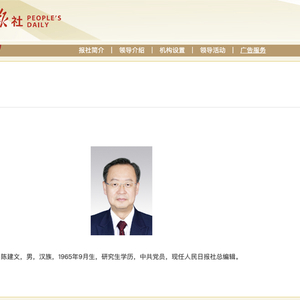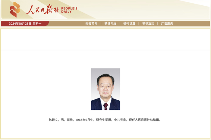 陈建文已任人民日报社总编辑 界面新闻 界面新闻官方账号 10月28日22:14 关注 听新闻 人民日报社官网“领导介绍”栏目信息更新显示,陈建文已任人民日报社总编辑。 陈建文,男,汉族,1965年9月生,研究生学历,中共党员,现任人民日报社总编辑。