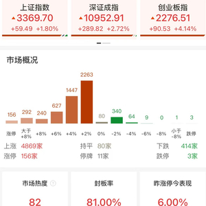 指数走强,沪指拉升涨逾2%,深成指涨3.01%,创业板指涨4.50%,沪深京三市上涨个股近5000只。