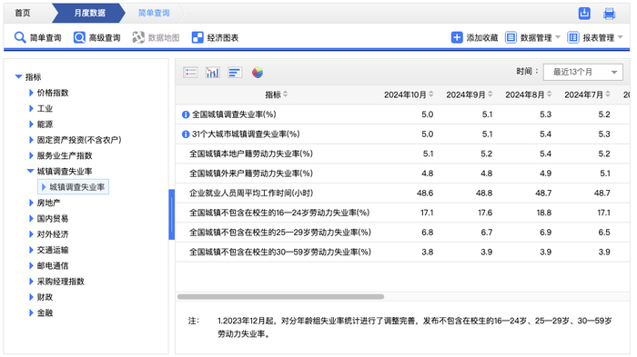 国家统计局发布10月份分年龄组失业率数据。10月份,全国城镇不包含在校生的16-24岁劳动力失业率为17.1%,不包含在校生的25-29岁劳动力失业率为6.8%,不包含在校生的30-59岁劳动力失业率为3.8%。