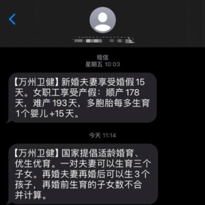 根据网民上传的短信截图显示,短信内容分为两类,其一写到“新婚夫妻享受婚假15天。女职工享受产假:顺产178天,难产193天,多胞胎每多生育1个婴儿+15天。”短信其二内容写到“国家提倡适龄婚育、优生优育。一对夫妻可以生育三个子女。再婚夫妻再婚后可以生3个孩子,再婚前生育的子女数不合并计算。”