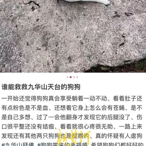 新黄河记者搜索社交平台发现,网传断脚白狗出现在九华山风景区天台峰,图片中的白狗左后腿前肢断裂,创面切口平整,还未结痂,呈血红色,没有撕扯痕迹。发帖者还称在游览途中遇见另外两只瘸腿流浪狗,怀疑有人虐狗。该消息迅速引发关注,多名网友跟帖称自己曾在该景区遇到其他断腿、断脚的狗。根据网友发布的图片显示,至少有五六只狗的腿部残缺,有的狗失去整条后腿,有的失去半条腿,有的仅失去脚掌。
