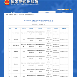 国家新闻出版署公布2024年11月份国产网络游戏审批信息 央视 2024.11.2017:08 关注 来源:央视网央视网消息:国家新闻出版署公布2024年11月份国产网络游戏审批信息,共112款游戏获批。