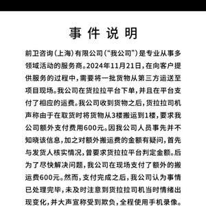 对于产生争议的600元搬运费,前卫咨询上海有限公司的事件说明称,2024年11月21日,该公司在向客户提供服务的过程中,需要将一批货物从第三方运送至项目现场。前卫咨询公司在货拉拉平台下单,并且在平台支付了相应的运费。收到货物后,货拉拉司机声称由于在取货时将货物从3楼搬运到1楼,要求额外支付费用600元。前卫咨询公司事件说明还称,因该公司人员事先并不知晓该信息,加之对额外搬运费的金额有疑问,首先与发货人核实情况,曾要求货拉拉平台判定金额。