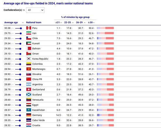 2024国家队平均年龄:国足28.89岁与阿根廷并列全球第11,第1超30