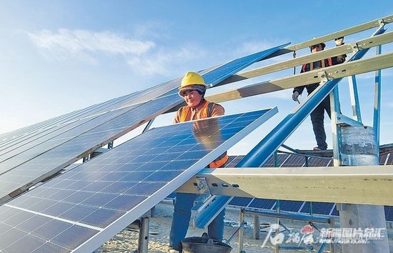 12月1日,位于和田市吉亚乡的华润新能源50万千瓦光伏治沙项目施工现场一派热火朝天景象。该项目总投资约15亿元,预计明年5月底实现全容量投产。图为工人在铺设光伏板。 石榴云/新疆日报记者 汤永摄