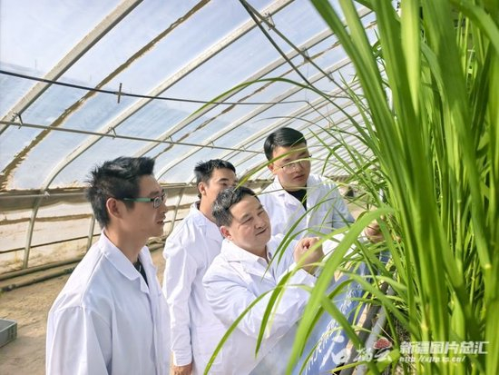 11月20日,和田地区和田县万亩设施农业基地沙漠温室水稻种植大棚内,中国农业科学院都市农业研究所首席科学家杨其长团队正在查看水稻长势。胡礼政摄