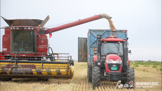 6月5日,喀什地区麦盖提县新疆五征绿色农业发展有限公司在塔克拉玛干沙漠边缘种植的6000余亩冬小麦收获场景(资料图)。买热古·买买提摄