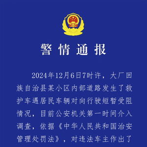 河北大厂公安局12月9日通报,12月6日7时许,大厂回族自治县某小区内部道路发生了救护车遇居民车辆对向行驶短暂受阻情况,目前公安机关第一时间介入调查,依据《中华人民共和国治安管理处罚法》,对违法车主作出了行政拘留处理。