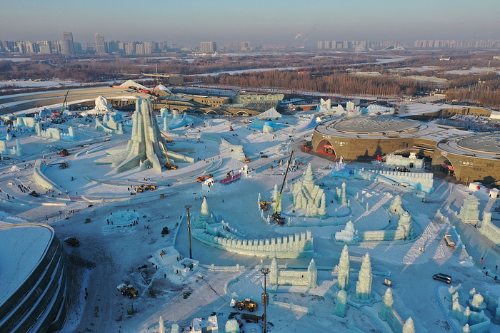 哈尔滨冰雪大世界园区施工现场,工人们正进行最后的收尾施工。各处冰景雪雕多数已完工,大部分脚手架已拆除,景区即将开门迎客。