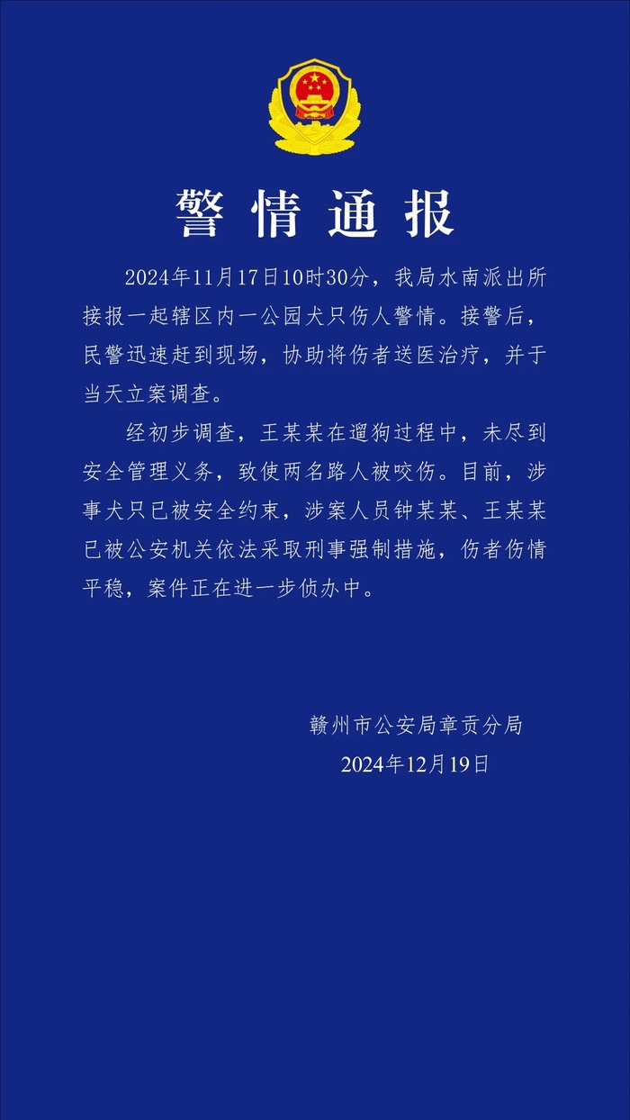 ·母女公园散步遭四条大型犬撕咬,江西赣州警方通报:两名涉案人员已被采取刑事强制措施。