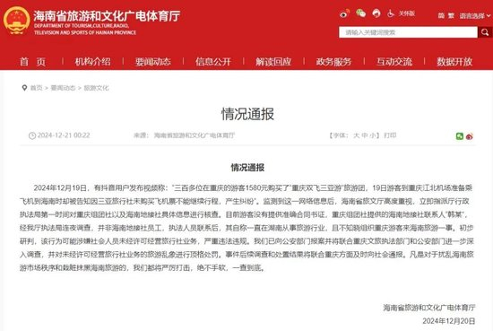 此前,海南省旅游和文化广电体育厅网站12月21日发布情况通报: