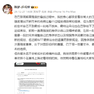 12月27日,陈梦在微博发文:在巴黎周期高强度的备战过程中,我的身心都承受着非常大的压力,同时随着备战强度增加不断而来的伤病让整个过程变得异常的艰难,但为国而战的心一次又一次的告诉自己不到最后一刻绝不放弃,最终这朵花也在巴黎结下了最好的果实。 奥运结束后,前期一直高强度的身体训练以及精神紧绷,在那一刻堆积到了顶点,我需要一段时间来调整自己的身体状态以及根据身体因素对自己接下来职业生涯进行新的规划,但近期WTT最新出台的退赛罚款新规定,因身体目前还无法负荷每一次高强度赛事,出于对国际组织的尊重,已于周一签署文件,最终做出退出世界排名的选择。