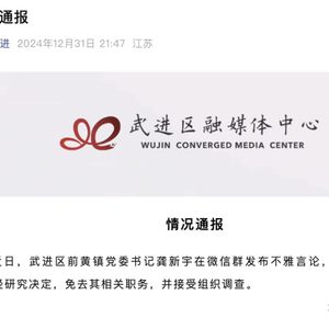 12月31日,江苏常州市武进区通报,近日,武进区前黄镇党委书记龚新宇在微信群发布不雅言论,造成社会不良影响,经研究决定,免去其相关职务,并接受组织调查。