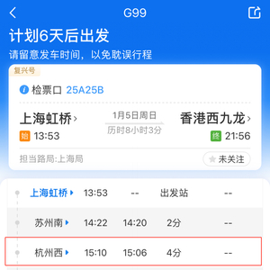 央视网消息:据杭州交通微信公众号消息,2025年1月5日起,杭州西站将首次开通往返香港西九龙的高铁。2025年1月5日零时起,全国铁路将实施2025年第一季度列车运行图,连接上海虹桥与香港西九龙的G99/G100次列车将改变路线,经停杭州西站,旅客可以持有效签注直达香港西九龙站。