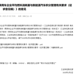 央视网消息:据工信部网站消息,为适应节能与新能源汽车产业发展需要,工业和信息化部装备工业一司组织起草了《关于2026—2027年度乘用车企业平均燃料消耗量与新能源汽车积分管理有关要求(征求意见稿)》,现向社会公开征求意见,请于2025年2月5日前反馈意见。