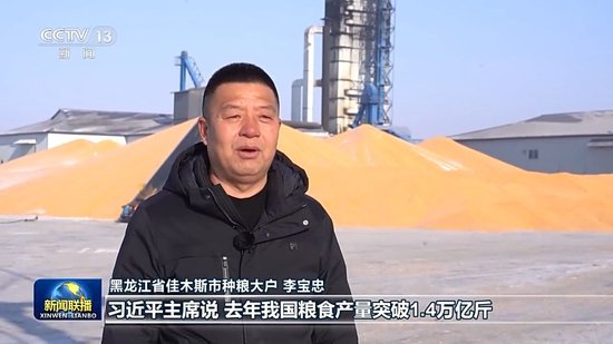 黑龙江省佳木斯市种粮大户 李宝忠:习近平主席说,去年我国粮食产量突破1.4万亿斤,中国碗装了更多中国粮。听到这话我心里特别自豪。今年春耕之前,我们要更新购置大型高端智能的玉米收割机,我要和乡亲们一起加油干,在农业现代化的道路上扎实走好每一步,用我们的双手把中国饭碗端得更牢。