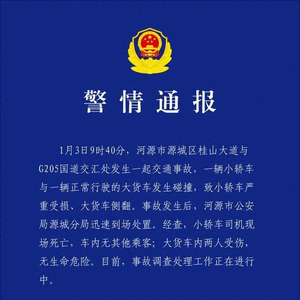 1月3日,广东河源市公安局源城分局通报,1月3日9时40分,河源市源城区桂山大道与G205国道交汇处发生一起交通事故,一辆小轿车与一辆正常行驶的大货车发生碰撞,致小轿车严重受损、大货车侧翻。事故发生后,河源市公安局源城分局迅速到场处置。经查,小轿车司机现场死亡,车内无其他乘客;大货车内两人受伤,无生命危险。目前,事故调查处理工作正在进行中。