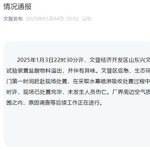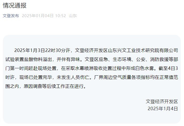 央视网消息:山东省威海市文登经济开发区1月4日通报,3日22时30分许,文登经济开发区山东兴文工业技术研究院有限公司试验装置盐酸物料溢出,并伴有异味。文登区应急、生态环境、公安、消防救援等部门第一时间赶赴现场处置,在采取水幕喷淋吸收处置过程中形成白色水雾。截至4日3时许,现场已处置完毕,未发生人员伤亡。厂界周边空气质量各项指标均在正常值范围之内,原因调查等后续工作正在进行。