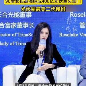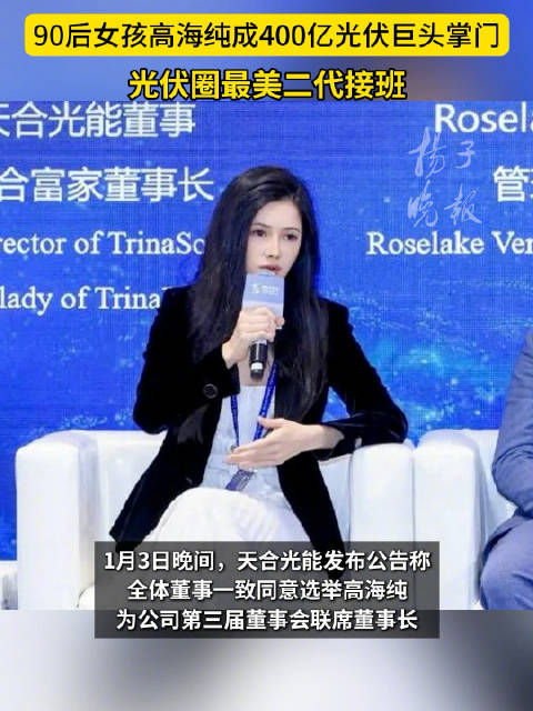 #光伏圈最美二代接班#[#93年女孩成400亿光伏巨头掌门#]1月3日晚间,天合光能发布公告称,全体董事一致同意选举高海纯为公司第三届董事会联席董事长。公开资料显示,高海纯生于1993年,女,毕业于美国布朗大学。2017年6月至今,高海纯历任天合光能战略投资部副总经理、天合富家能源股份有限公司董事长;2024年6月至今,担任天合光能董事。值得关注的是,高海纯与天合光能创始人、控股股东及实际控制人高纪凡为父女关系,与单独持有天合光能5%以上股份的股东吴春艳为母女关系。高海纯的父亲、天合光能的“创一代”高纪凡是光伏行业的领军人物。2006年,天合光能登陆纽交所,成为常州市首家在纽交所上市的民企。2020年6月,已从纽交所退市的天合光能,成功挂牌科创板。1月3日,天合光能股价以18.66元报收,最新市值达407亿元。