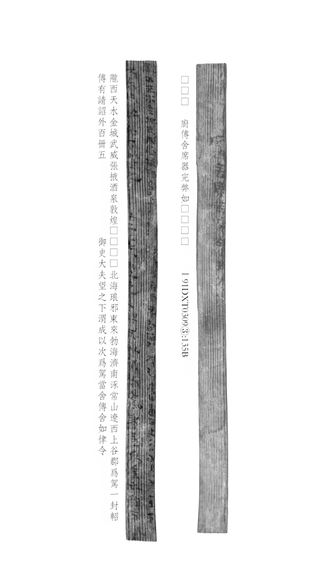 1991年出土于悬泉置遗址。木简一枚,左右均有残缺,长23.2厘米、宽1.3厘米、厚0.2厘米,松木材质。正面为两行书写,反面一行书写。此简当属传信简,是秦汉时期朝廷公务人员在出使、巡行及办理有关公务时要求所到各地给予通行、过关、乘车、食宿等各种方便和特权的公文凭信。简文中出现的“武威、张掖、酒泉、敦煌”即著名的河西四郡。现藏甘肃简牍博物馆。