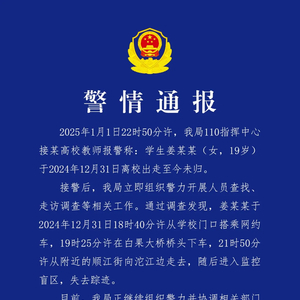成都市金堂县公安局2025年1月9日通报,2025年1月1日22时50分许,金堂县公安局110指挥中心接某高校教师报警称:学生姜某某(女,19岁)于2024年12月31日离校出走至今未归。