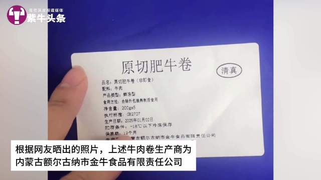 记者采访了其中一位购买者。他告诉记者,物流显示他收到的牛羊肉卷从山东聊城发货,他询问了客服,客服回复说从山东云仓发货,产地为内蒙古。他向记者展示收到的羔羊肉卷的包装,上面标明生产商为“内蒙古额尔古纳市金牛食品有限责任公司”,包装上还有动物产品检疫合格标志。