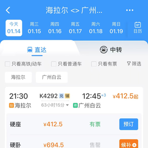 海拉尔前往广州白云的K4292次列车票价为412.5元起,截至14日16时,硬卧和软卧已售罄,处于候补状态,硬座和无座仍有部分余票。