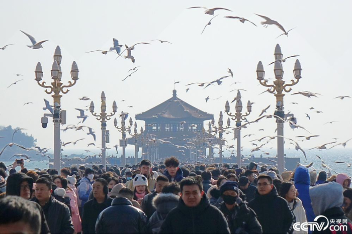 1月13日,山东青岛栈桥景区海鸥翔集,市民和游客纷至沓来,人鸥亲密互动,呈现冬日一道独特的风景。