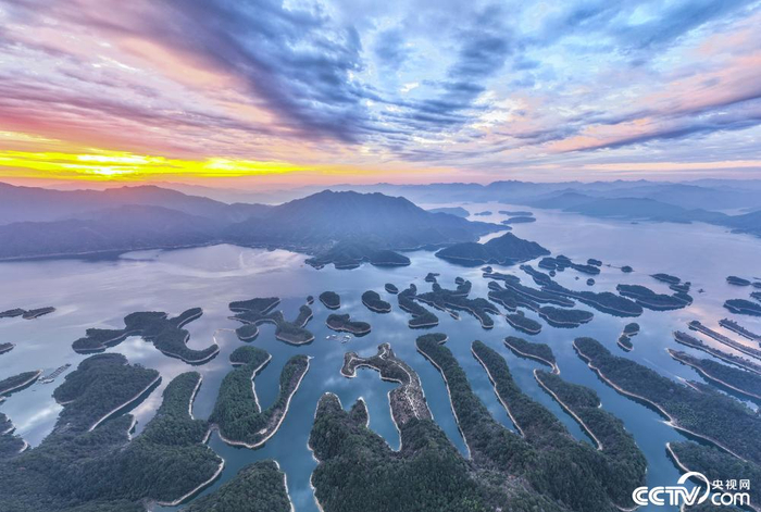 1月14日清晨,杭州淳安县千岛湖珍珠广场,红日喷薄,霞红遍天,碧波倒影,组成一幅幅景美如画的千岛湖冬日晨景。
