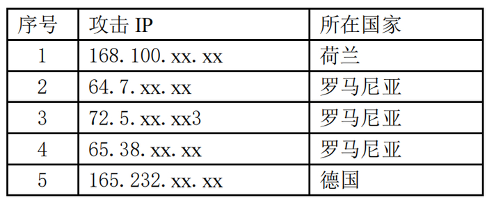 攻击者使用的5个跳板IP完全不重复,位于德国和罗马尼亚等地,反映出其高度的反溯源意识和丰富的攻击资源储备。