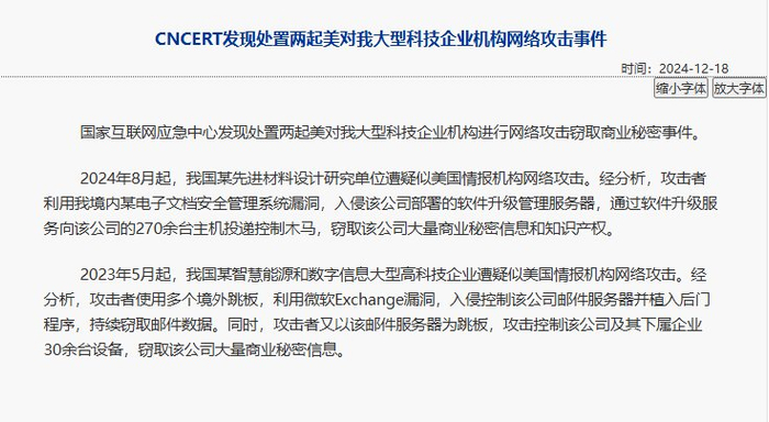 央视网消息:1月17日,国家互联网应急中心CNCERT发布报告,公布美对我国某先进材料设计研究院的网络攻击详情。此前在2024年12月18日发布公告称,发现处置两起美对我大型科技企业机构网络攻击事件。