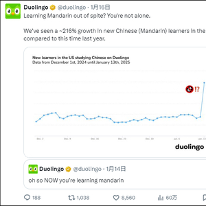 据香港《南华早报》1月17日报道,多款语言学习软件的数据显示,最近在这些平台上学习说普通话的美国用户数激增。多邻国(Duolingo)就表示,与去年同期相比,美国新学习普通话的用户增长了约216%。该公司称,这一增长幅度“远超”其他语言,即便是最受欢迎的一些语种也无法与之相比。例如,同期学习西班牙语的用户仅增长了40%。