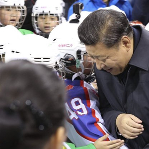 2017年2月24日,习近平在五棵松体育中心同冰球小队员“撞肩”互动