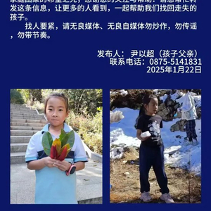 这则寻人启事显示,8岁女童尹潇楠于2025年1月19日14时40分左右在云南省保山市腾冲市青草岭附近游玩时走失,至今下落不明。