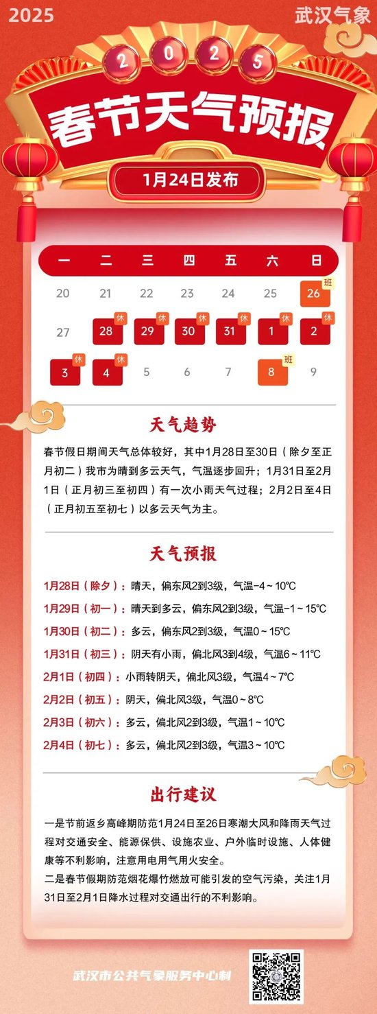 节前返乡高峰期防范:24日至26日寒潮大风和雨雪天气对交通安全、设施农业、户外临时设施、人体健康等不利影响,注意用电用气用火安全;春节假期关注30日至31日降水过程对交通出行的不利影响。
