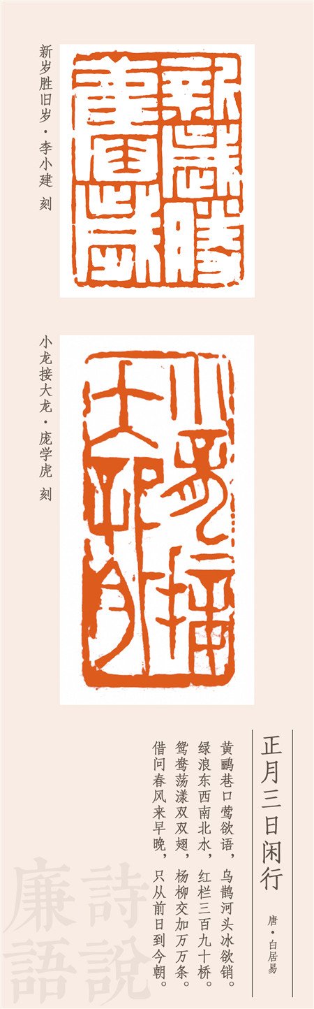 先看白居易的这一首,公元826年的这一天,作者在苏州刺史任上,选择了街市闲游,太守与民同乐,深入市井烟火。苏州的大年初三,春天的气息已经很浓了,黄鹂巷娇莺鸣唱,乌鹊河残冰消融,走过围着红栏的一座座小桥,看到四处的湖水荡漾着绿浪,鸳鸯双双在水中徜徉,杨柳万条在风中摇曳。面对大好春光,作者欣喜地问道:春天究竟是何时到来的呢?他自问自答:只不过是从前日到今日,花了三天时间而已。这个回答,只是诗人浪漫而又诗意的说法,是在表达新年伊始,万象更新,风光焕然,感觉春天就是追着春节突然而来的。从这首诗可以看出白居易对时令节气变化的敏感,对坊间里巷民生的关注,这是作为一名地方官极为优秀的品质。