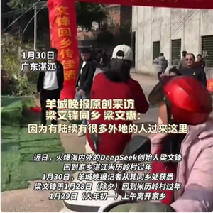 今年春节,近日火爆全球的DeepSeek创始人梁文锋回到家乡——广东省湛江市吴川市覃巴镇米历岭村过年。据其同乡透露,梁文锋于1月28日(除夕)回到米历岭村过年,1月29日(大年初一)上午离开家乡。