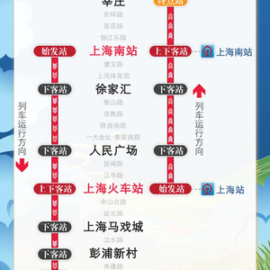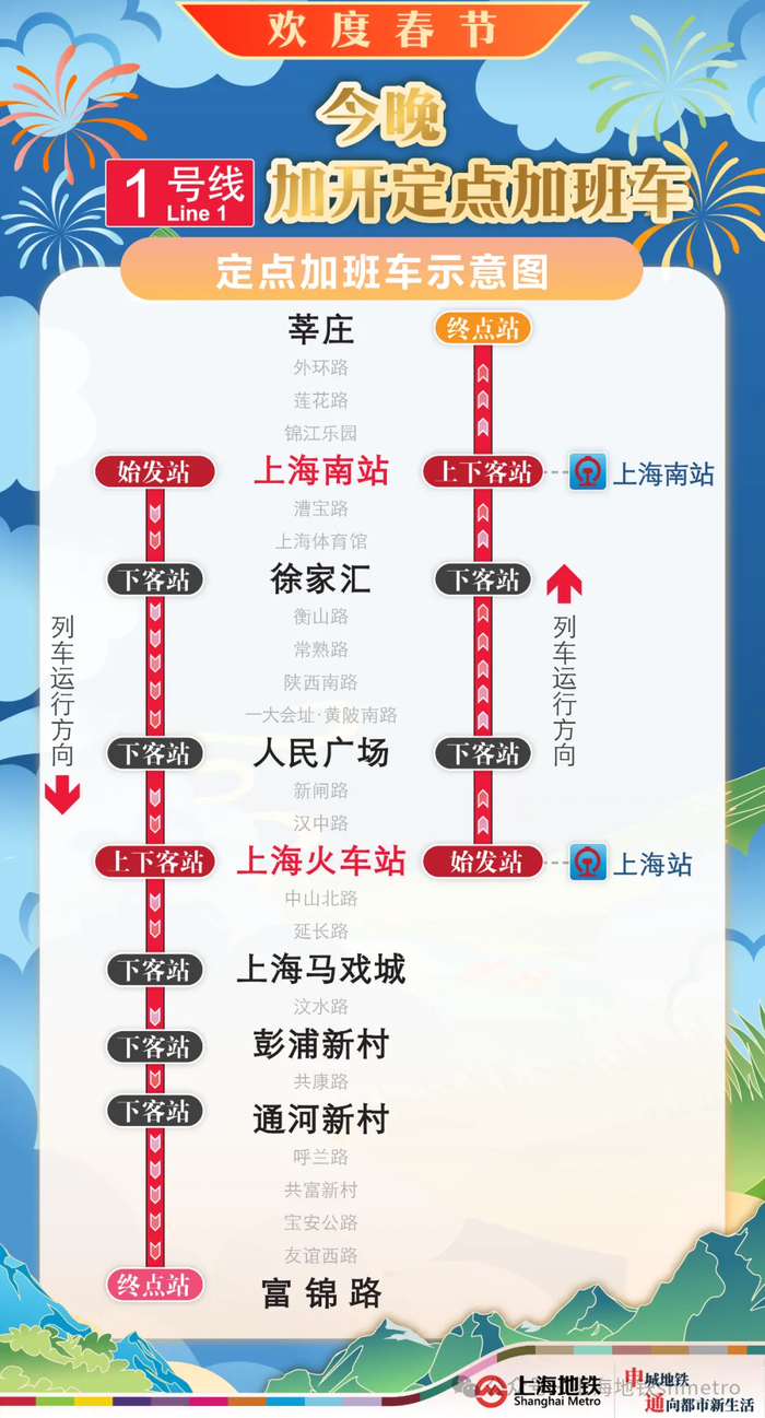 【1号线:上海火车站站往莘庄站方向】在上海火车站站末班车(23:00)后,往莘庄站加开定点加班车至次日0时。加班车停靠:上海火车站站、人民广场站、徐家汇站、上海南站站、莘庄站(终点站),其余车站跳停。停靠车站中,上海火车站站(始发站)、上海南站站可上下客,其余车站只下不上。