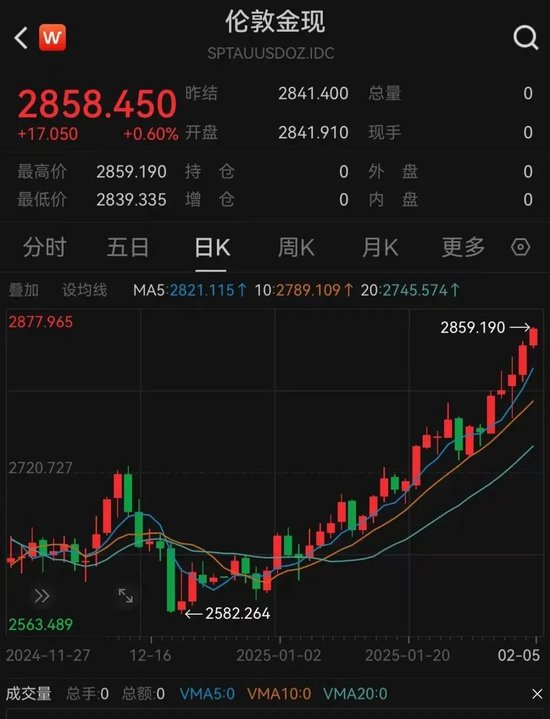 据报道,2月5日,现货黄金再创新纪录,摸高至2859美元/盎司。COMEX黄金也在盘中创下历史新高,最高涨至2886美元/盎司。