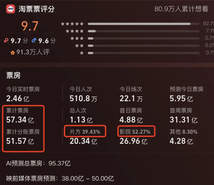 按照95亿的最终票房计算,电影分账票房约为85亿元。其中一大半的钱要分给影院,数据显示,影院分账比例52.27%,可分得约44亿元。另一部分片方分账比例为39.24%,可分得约33亿元。