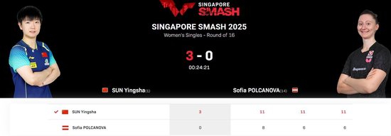轻松晋级!孙颖莎3-0横扫索菲亚,晋级新加坡大满贯女单8强