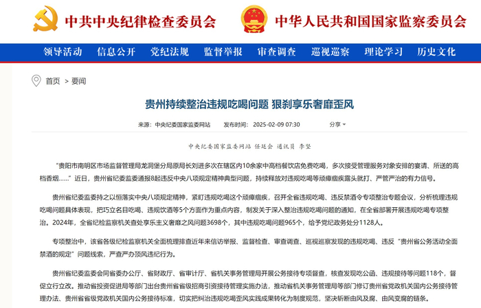 《中国纪检监察报》新闻版头条、中央纪委国家监委网站|贵州持续整治违规吃喝问题 狠刹享乐奢靡歪风