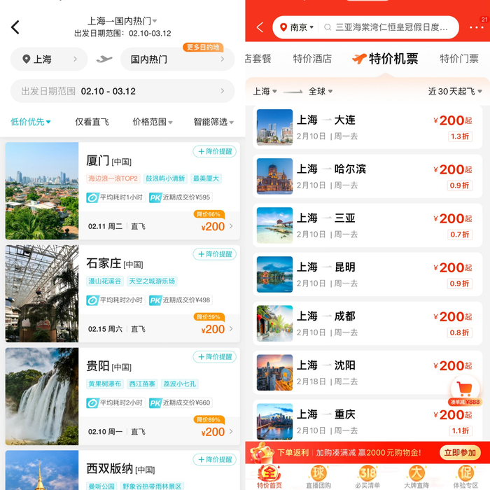 若从OTA平台报价来看,去哪儿平台展示的上海飞往石家庄、贵阳、西双版纳、长春等航班票价均卡着200元的“基准线”;北京飞往大连、兰州、鞍山等地航班票价也显示200元整。携程平台“特价机票”一栏,上海-哈尔滨、三亚、成都、沈阳等最低价格也都在200元。