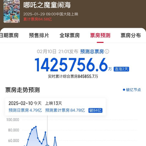 猫眼:《哪吒之魔童闹海》最新预测总票房142.5亿元 界面新闻 界面新闻官方账号 02月10日21:24 关注 听新闻 2月10日晚间,据猫眼专业版预测票房数据显示,《哪吒之魔童闹海》最新预测总票房142.5亿元,预测最终票房将登顶全球动画电影票房榜,冲击全球电影票房榜前七。