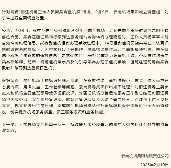 ·丽江机场“值机员撕登机牌”调查结果:两名涉事人员待岗,多个部门负责人被警告。